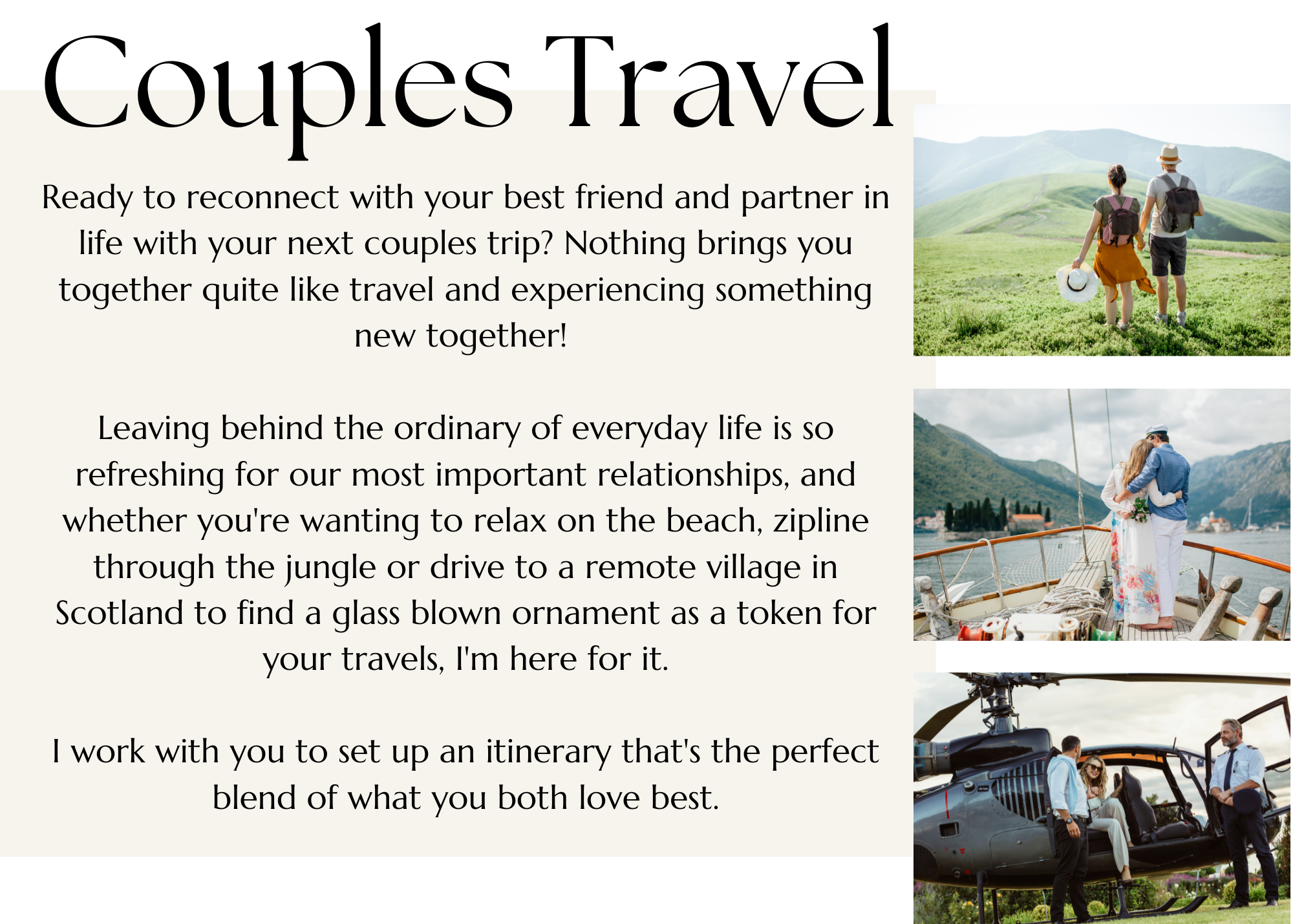 As a wife and mom, I understand how overwhelming and time consuming planning your next vacation can feel; but as a traveler myself, I also know how new adventures can truly transform and rejuvenate your mind, body and soul. Which is why I love working with couples and families to help you avoid the overwhelm + difficulties of planning, and simply enjoy each destination, experience and time with one another.